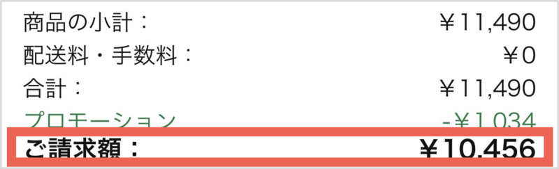 クーポンが適用され、割引価格の10,456円(税込)が表示されればOKです。