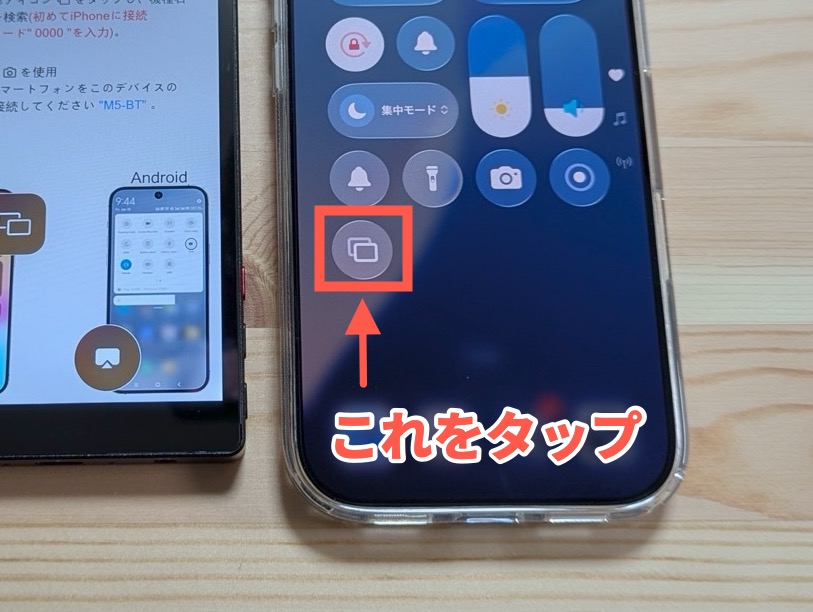( 画面ミラーリングのボタンが表示されない場合は、ボタンが何も表示されていない場所で長押します。すると、画面下に「コントロールを追加」という文字が表示されるので、そこから「画面ミラーリング」のボタンを追加します)