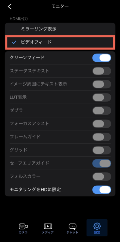 Blackmagic Camera アプリの設定で【モニター】 → 【HDMI出力】と進み「ビデオフィード」にチェックを入れると「全画面表示」でモニターができました。ディスプレイの表示領域をフル活用できるので、見やすさが段違いです。実際の見え方は下の動画で確認してください。上のサンプル動画と見比べると、表示領域の違いがはっきりわかると思います。