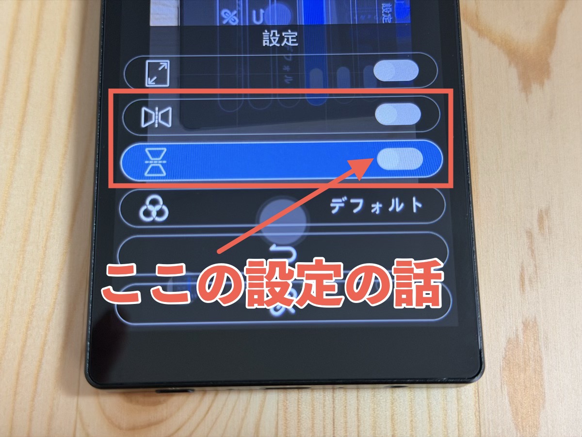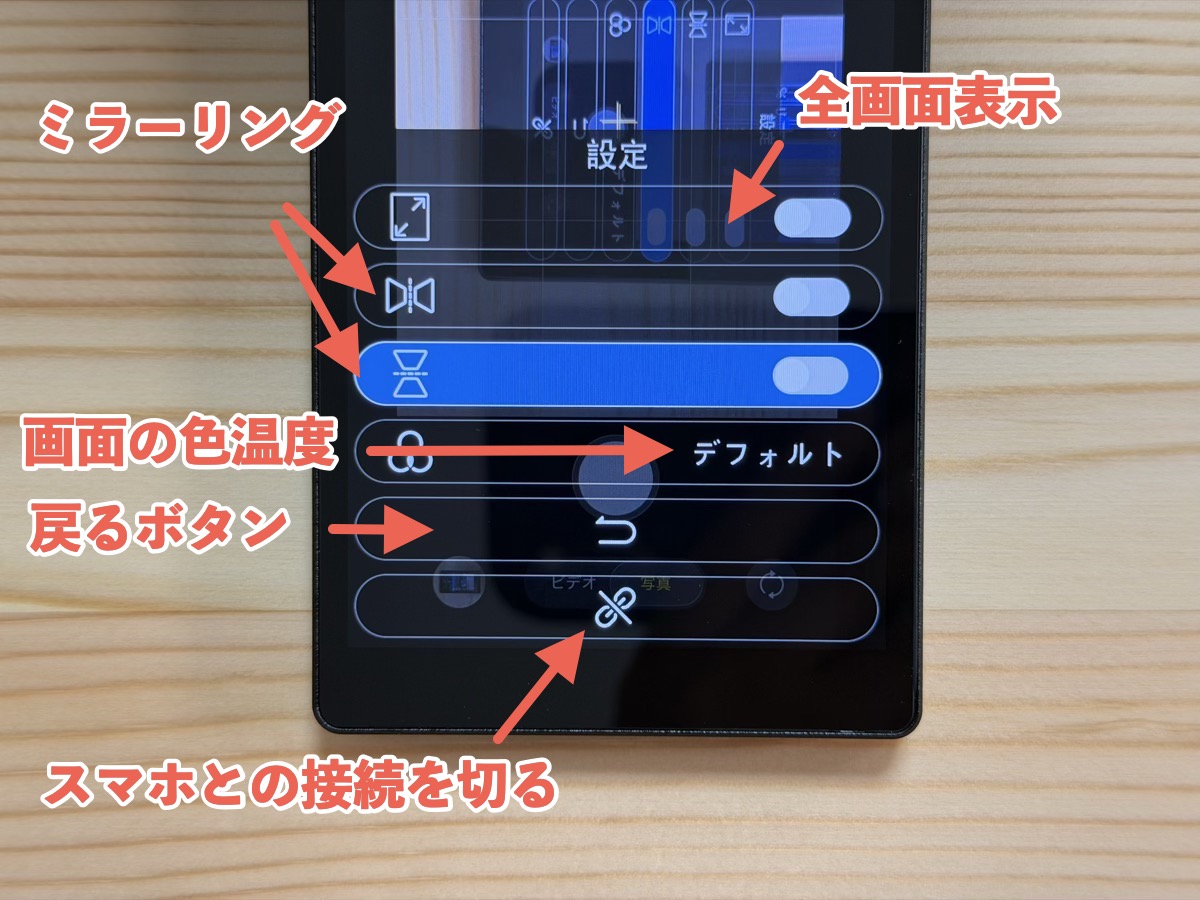 モニター横の設定ボタンを押すと、全画面表示/ミラーリング(左右反転/上下反転)/画面の色温度(デフォルト・暖色・寒色)/戻る/切断、といった機能が利用できます。最も重要なのは「ミラーリング機能」で、自撮り撮影を行う際にこの機能を使用します。なお、全画面表示というのは、元の映像を無理やり引き伸ばして表示する機能でした、自然な全画面表示を行いたい場合は、Blackmagic Camera アプリの機能がおすすめです。