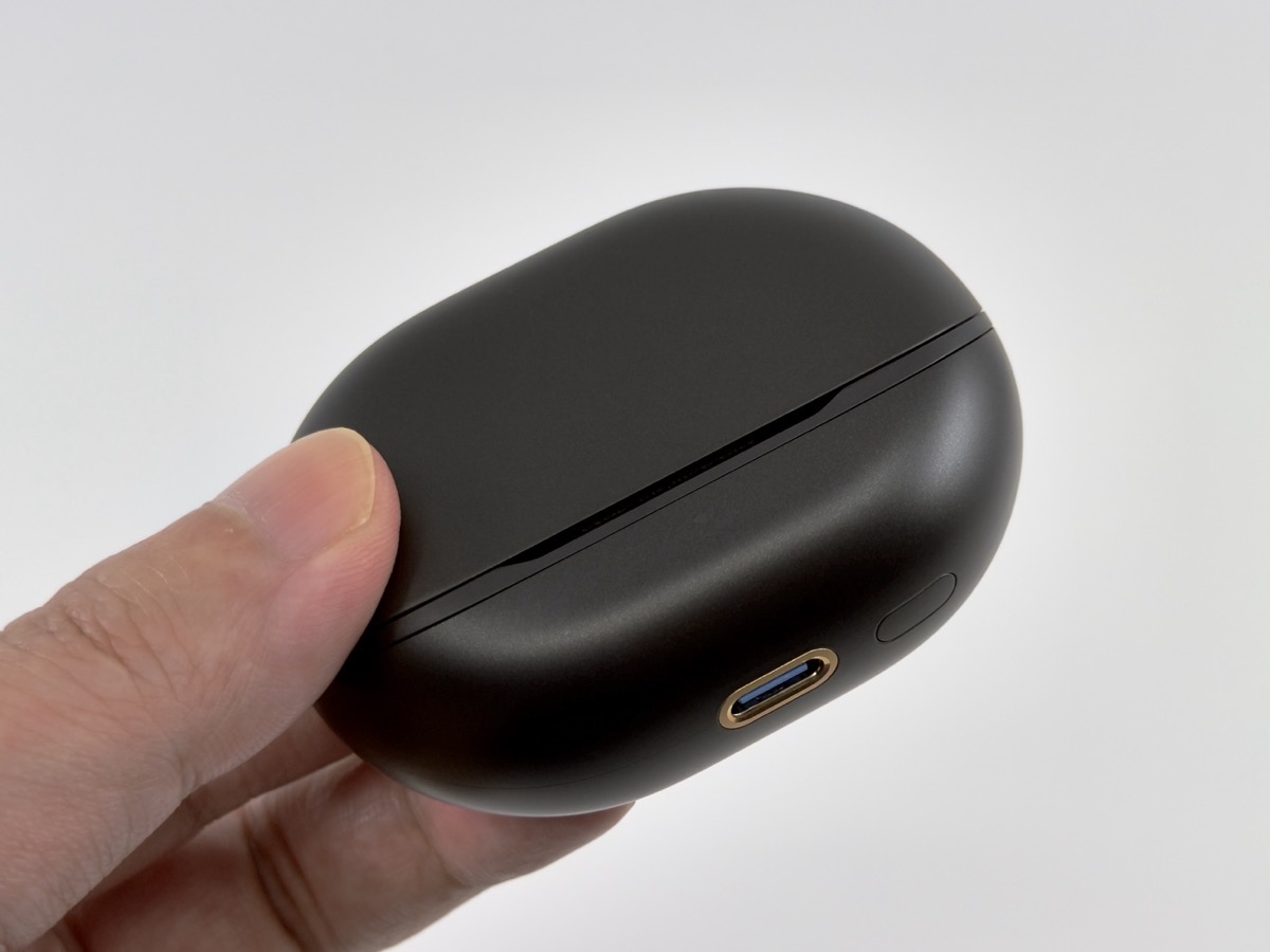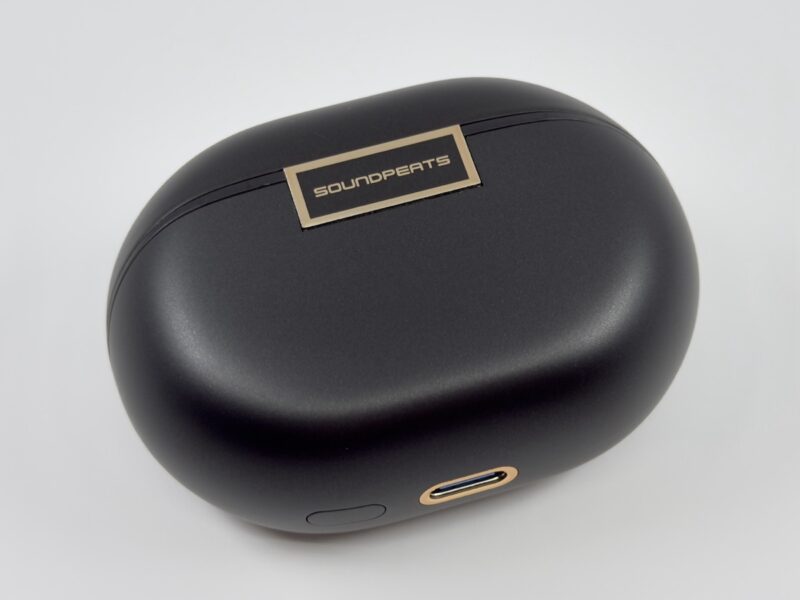 ケースは、指紋が目立ちにくいマットな質感。サラサラとした手触りで、日常使いでも汚れがつきにくい印象。写真では背面のSOUNDPEATSの文字が目立って見えますが、反射で目立っているだけで、実際には写真ほど目立ちません。