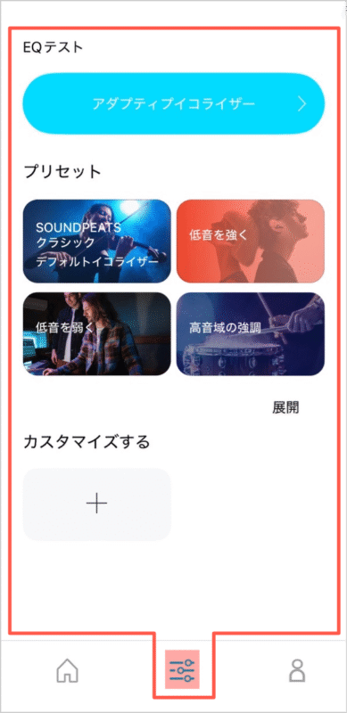 中央の「EQ」タブでは、音質を自分好みにチューニングできます。