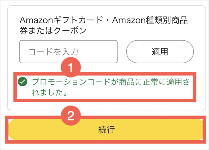 プロモーションコードが適用されたことを確認して[続行]をタップ